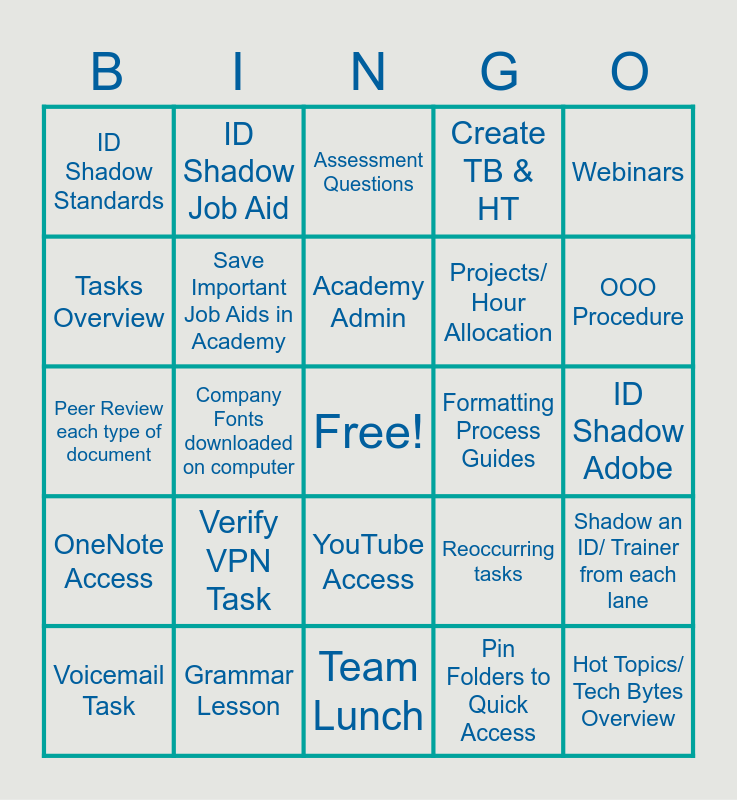 This bingo card has a free space and 24 words: Voicemail Task, Verify VPN Task, Academy Admin, Pin Folders to Quick Access, Webinars, ID Shadow Standards, ID Shadow Job Aid, Assessment Questions, Formatting Process Guides, ID Shadow Adobe, Peer Review each type of document, Save Important Job Aids in Academy, Reoccurring tasks, Shadow an ID/ Trainer from each lane, Tasks Overview, Grammar Lesson, Team Lunch, Create TB & HT, OOO Procedure, OneNote Access, Company Fonts downloaded on computer, YouTube Access, Projects/ Hour Allocation and Hot Topics/ Tech Bytes Overview.