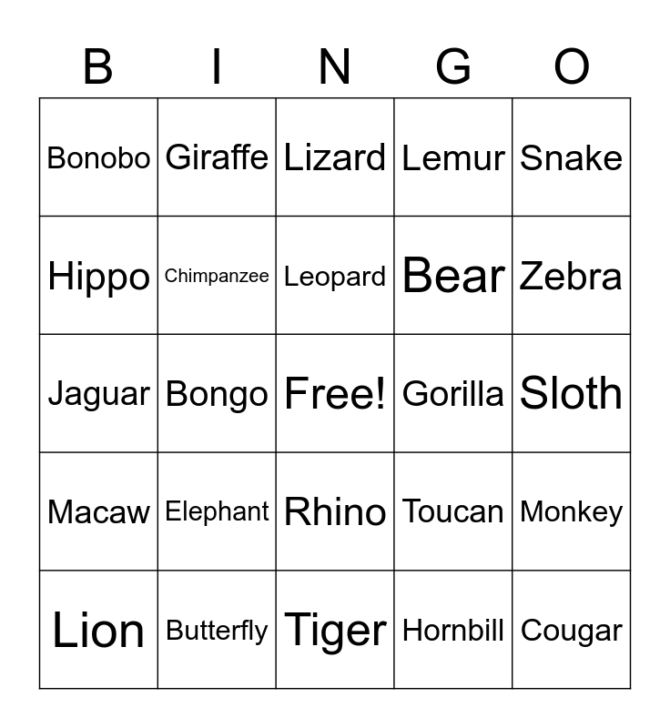 This bingo card has a free space and 25 words: Elephant, Tiger, Leopard, Lion, Snake, Bonobo, Hippo, Giraffe, Gorilla, Rhino, Bear, Jaguar, Toucan, Monkey, Chimpanzee, Crocodile, Sloth, Lizard, Zebra, Bongo, Cougar, Butterfly, Macaw, Lemur and Hornbill.