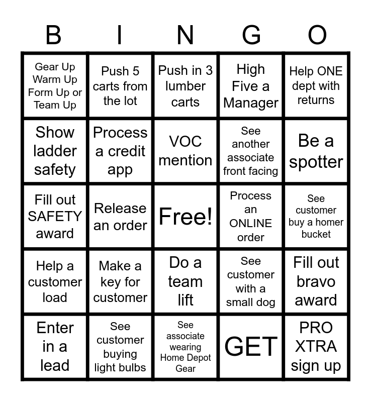 This bingo card has a free space and 24 words: Enter in a lead, Make a key for customer, VOC mention, GET, Help ONE dept with returns, Gear Up Warm Up Form Up or Team Up, Push 5 carts from the lot, Push in 3 lumber carts, Process an ONLINE order, See customer buy a homer bucket, Fill out SAFETY award, Process a credit app, See customer with a small dog, Fill out bravo award, Show ladder safety, See customer buying light bulbs, See associate wearing Home Depot Gear, High Five a Manager, Be a spotter, Help a customer load, Release an order, Do a team lift, See another associate front facing and PRO XTRA sign up.