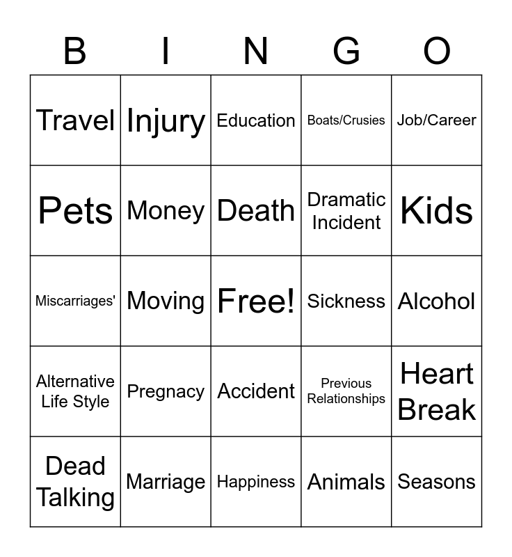 This bingo card has a free space and 24 words: Pregnacy, Marriage, Death, Dead Talking, Job/Career, Travel, Pets, Injury, Sickness, Accident, Dramatic Incident, Miscarriages', Previous Relationships, Heart Break, Money, Animals, Alcohol, Education, Kids, Moving, Seasons, Alternative Life Style, Boats/Crusies and Happiness.