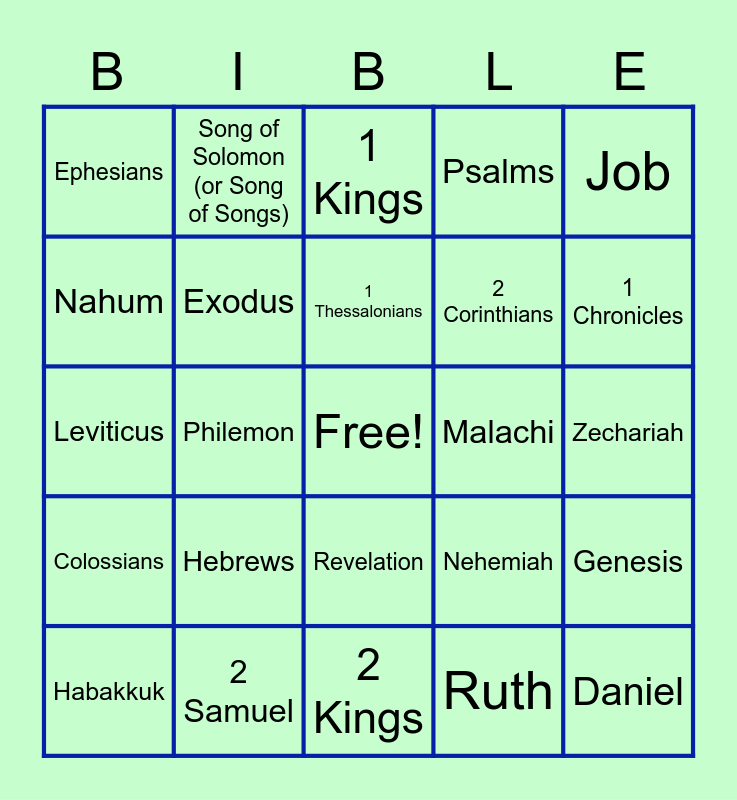 This bingo card has a free space and 66 words: Galatians, Amos, Zephaniah, Genesis, John, 1 Samuel, Song of Solomon (or Song of Songs), Mark, 1 Thessalonians, Ezekiel, Revelation, Hosea, Zechariah, Job, 2 Timothy, Nahum, Philemon, Ephesians, Philippians, 2 Corinthians, Hebrews, Colossians, Psalms, Obadiah, Jeremiah, 1 Corinthians, Joshua, Lamentations, Daniel, Esther, Habakkuk, Numbers, Jonah, 2 Thessalonians, Nehemiah, 2 Samuel, Titus, Leviticus, Ruth, Judges, Exodus, Haggai, Malachi, Joel, James, Matthew, 1 Chronicles, Ezra, 1 John, Acts of the Apostles, 1 Peter, Micah, Ecclesiastes, Jude, Romans, Isaiah, 3 John, 2 Chronicles, 1 Kings, 2 Kings, 1 Timothy, Proverbs, 2 Peter, 2 John, Luke and Deuteronomy.