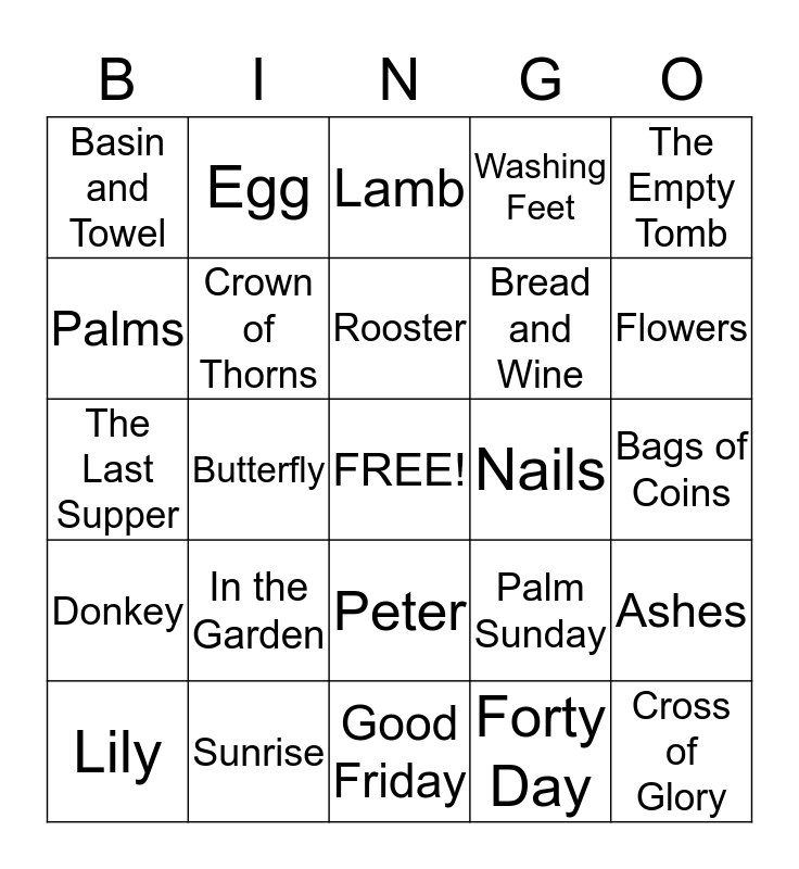 This bingo card has a free space and 24 words: In the Garden, Sunrise, Rooster, Lily, The Empty Tomb, Basin and Towel, Palms, Egg, Nails, Peter, Bread and Wine, The Last Supper, Palm Sunday, Ashes, Crown of Thorns, Forty Day, Bags of Coins, Lamb, Flowers, Butterfly, Cross of Glory, Donkey, Washing Feet and Good Friday.