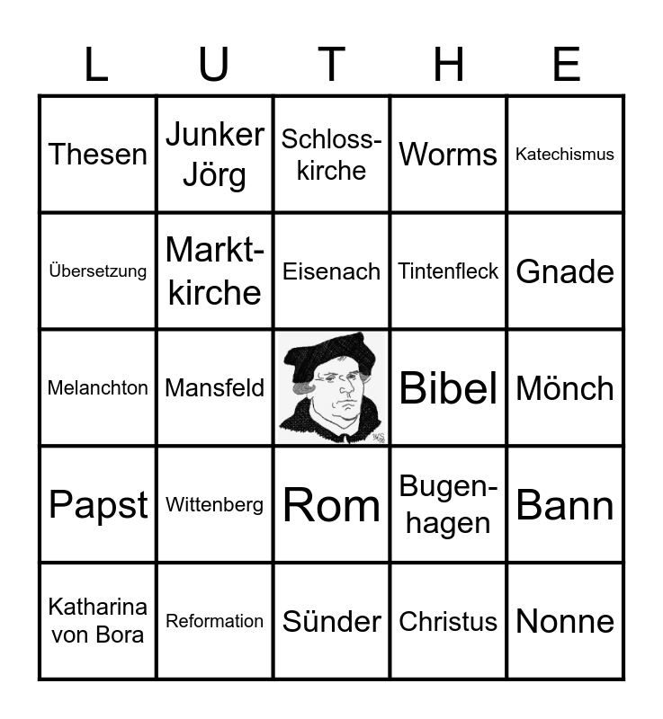 This bingo card has a free space and 29 words: Katharina von Bora, Kurfürst, Mansfeld, Eisleben, Thesen, Schloss-kirche, Markt-kirche, Wittenberg, Bibel, Reformation, Mönch, Nonne, Sünder, Christus, Gnade, Glauben, Rom, Papst, Katechismus, Melanchton, Bugen-hagen, Wartburg, Tintenfleck, Übersetzung, Worms, Junker Jörg, Bann, Eisenach and Gewitter.
