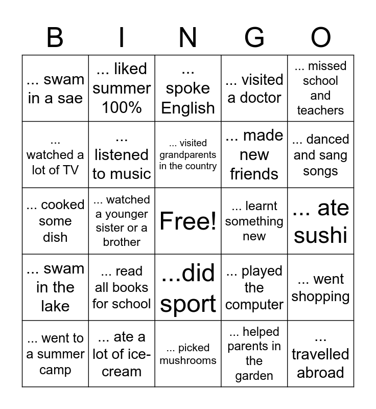 This bingo card has a free space and 24 words: ... read all books for school, ... ate a lot of ice-cream, ... visited grandparents in the country, ... went to a summer camp, ... missed school and teachers, ... swam in a sae, ... watched a lot of TV, ... liked summer 100%, ... learnt something new, ...did sport, ... made new friends, ... cooked some dish, ... played the computer, ... went shopping, ... listened to music, ... helped parents in the garden, ... ate sushi, ... spoke English, ... danced and sang songs, ... watched a younger sister or a brother, ... travelled abroad, ... swam in the lake, ... visited a doctor and ... picked mushrooms.