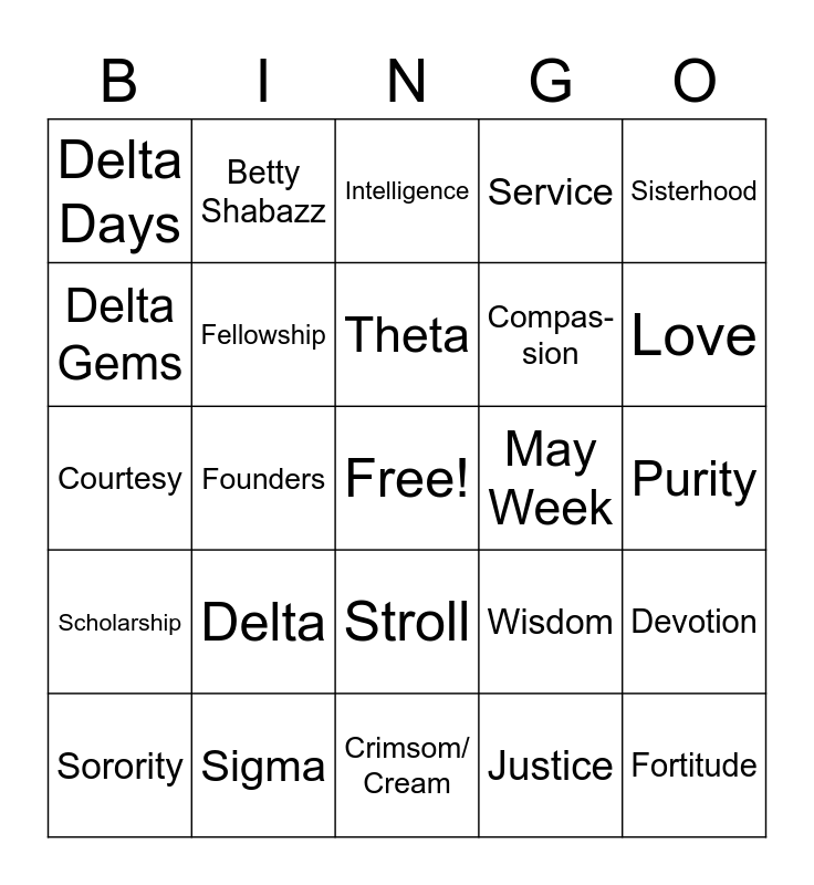 This bingo card has a free space and 24 words: Delta, Sigma, Theta, Sorority, Sisterhood, Delta Days, Delta Gems, Betty Shabazz, May Week, Stroll, Compas- sion, Courtesy, Wisdom, Devotion, Fellowship, Justice, Purity, Intelligence, Love, Founders, Fortitude, Scholarship, Service and Crimsom/ Cream.