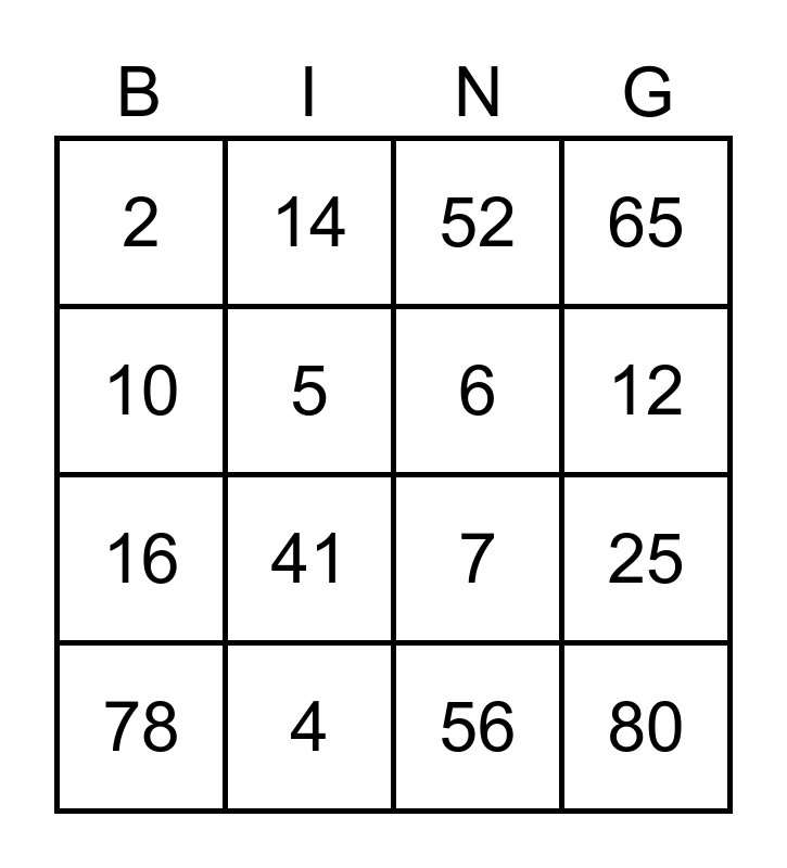This bingo card has 25 words: 1, 8, 12, 3, 10, 2, 5, 14, 4, 13, 16, 7, 9, 11, 6, 15, 56, 52, 41, 25, 78, 50, 80, 65 and 9.