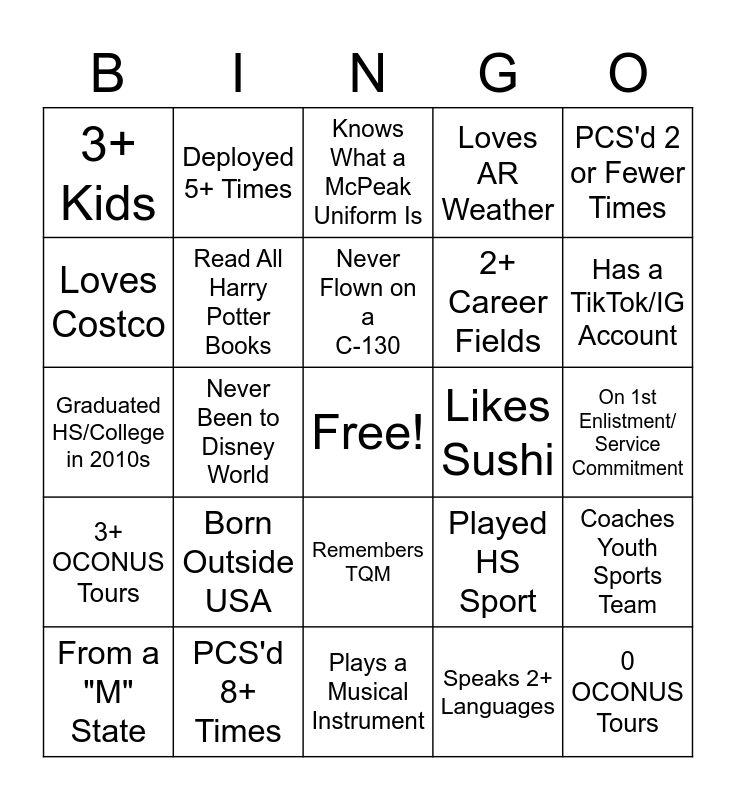 This bingo card has a free space and 24 words: Born Outside USA, PCS'd 8+ Times, Never Flown on a C-130, From a "M" State, PCS'd 2 or Fewer Times, 3+ Kids, Loves Costco, Deployed 5+ Times, Likes Sushi, Remembers TQM, 2+ Career Fields, Graduated HS/College in 2010s, Played HS Sport, Coaches Youth Sports Team, Read All Harry Potter Books, Speaks 2+ Languages, On 1st Enlistment/ Service Commitment, Knows What a McPeak Uniform Is, Has a TikTok/IG Account, Never Been to Disney World, 0 OCONUS Tours, 3+ OCONUS Tours, Loves AR Weather and Plays a Musical Instrument.