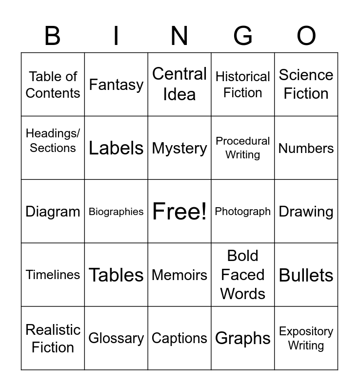 This bingo card has a free space and 24 words: Realistic Fiction, Tables, Mystery, Graphs, Science Fiction, Table of Contents, Fantasy, Central Idea, Photograph, Drawing, Diagram, Labels, Bold Faced Words, Bullets, Headings/ Sections, Glossary, Captions, Historical Fiction, Numbers, Timelines, Biographies, Memoirs, Procedural Writing and Expository Writing.