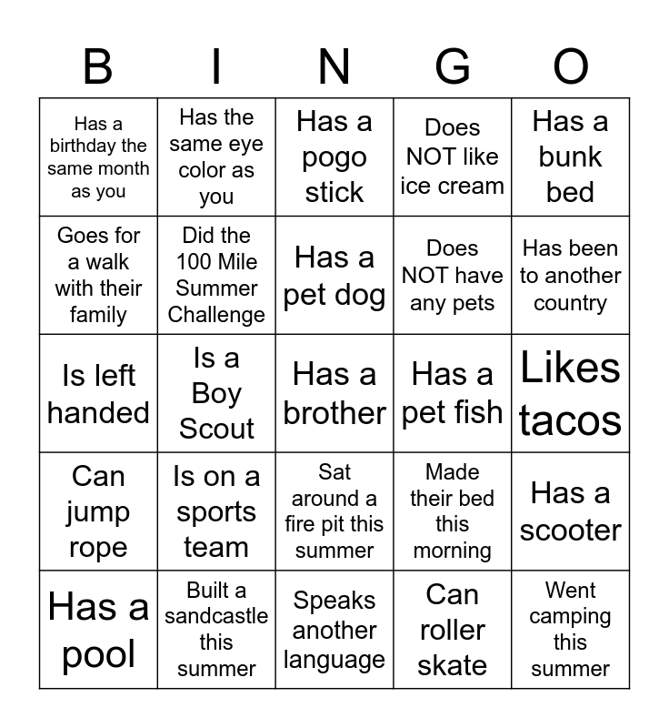 This bingo card has 60 words: Free!, Built a sandcastle this summer, Can do a cartwheel, Can jump rope, Can roller skate, Can swim underwater, Did the 100 Mile Summer Challenge, Does martial arts, Does NOT have any pets, Does NOT have brothers or sisters, Does NOT like ice cream, Does yoga, Goes for a walk with their family, Goes to the After School Program, Goes to the Before School Program, Has a birthday the same month as you, Has a brother, Has a bunk bed, Has a parent who is a teacher, Has a pet dog, Has a pet fish, Has a pogo stick, Has a pool, Has a scooter, Has a sister, Has a trampoline, Has been on a cruise ship, Has been to a water park, Has been to another country, Has broken a bone, Has flown a kite, Has flown on an airplane, Has green on their face mask, Has NEVER flown on an airplane, Has the same eye color as you, Has traveled out of New Jersey this summer, Hiked a trail this summer, Is a Boy Scout, Is a Girl Scout, Is left handed, Is new to Cambridge, Is on a sports team, Likes tacos, Likes to eat sushi, Made their bed this morning, Plays the piano, Ran through a sprinkler, Read more than (1) book this summer, Rode a rollercoaster this summer, Sat around a fire pit this summer, Speaks another language, Takes dance class, Takes gymnastics lessons, Took the bus to school today, Walked to school today, Was born in a different state, Was driven to school in a car today, Watched the Summer Olympics, Went camping this summer and Went to a camp this summer.