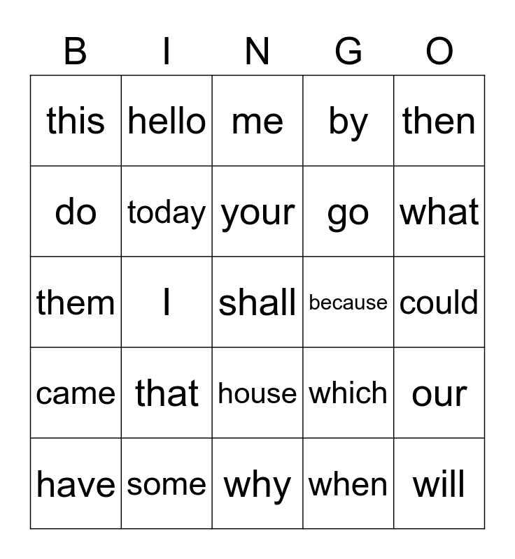 This bingo card has a free space and 29 words: have, come, I, you, this, me, today, that, because, some, could, will, why, when, what, they, house, came, then, them, which, how, go, do, by, hello, our, your and home.