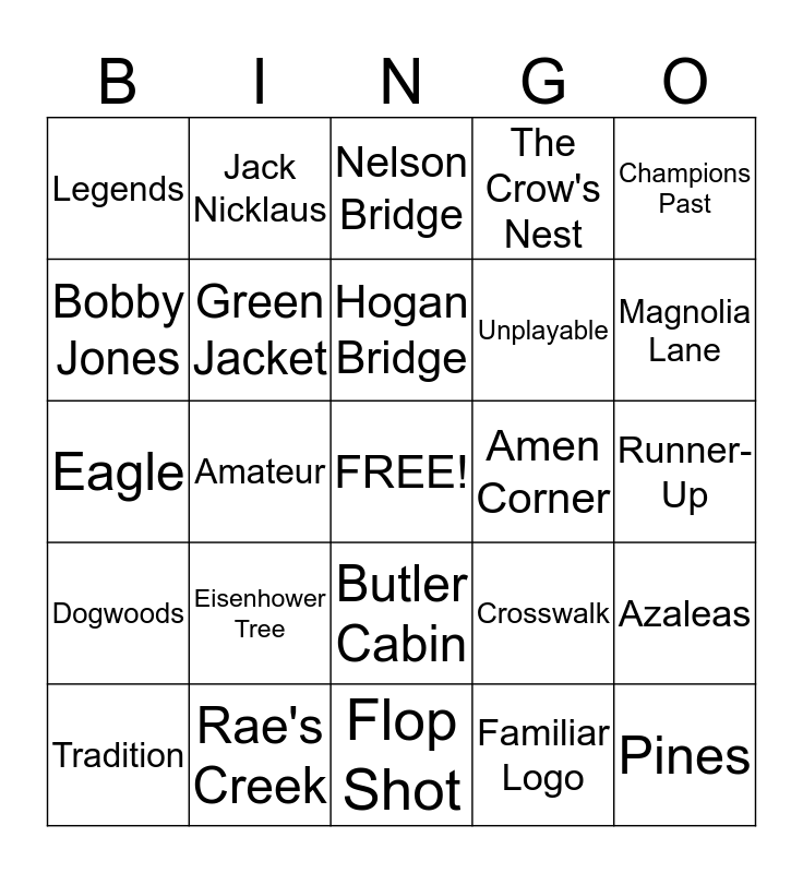 This bingo card has a free space and 24 words: Eisenhower Tree, Rae's Creek, Hogan Bridge, Tradition, Champions Past, Legends, Bobby Jones, Jack Nicklaus, Amen Corner, Butler Cabin, Unplayable, Eagle, Crosswalk, Azaleas, Green Jacket, Familiar Logo, Runner-Up, Nelson Bridge, Magnolia Lane, Amateur, Pines, Dogwoods, The Crow's Nest and Flop Shot.
