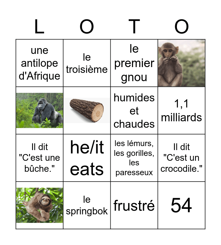 This bingo card has 16 images and 24 words: les lémurs, les gorilles, les paresseux, le Sahara, humides et chaudes, le désert et la savane, l'autre gnou, 1,1 milliards, le baobab, 54, Il dit "C'est un crocodile.", frustré, le springbok, 22, une antilope d'Afrique, le premier gnou, le crocodile, Il dit "C'est une bûche.", le français, he/it says, he/it moves, he/it eats, le premier, l'autre, le deuxième and le troisième.