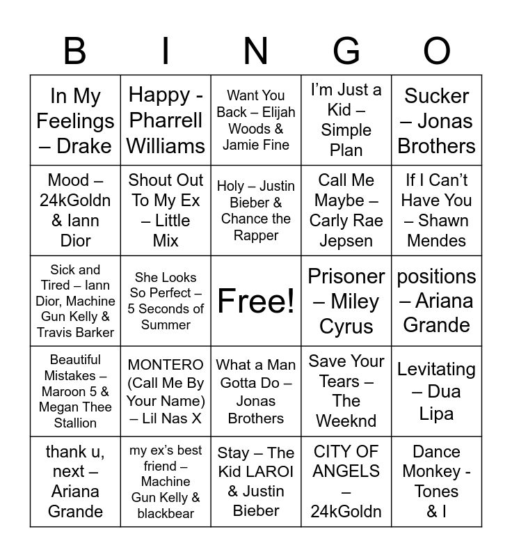 This bingo card has a free space and 46 words: Bad Habits - Ed Sheeran, Dance Monkey - Tones & I, Girls Like You – Maroon 5 & Cardi B, Stay – The Kid LAROI & Justin Bieber, MONTERO (Call Me By Your Name) – Lil Nas X, Watermelon Sugar – Harry Styles, Happy - Pharrell Williams, Dark Horse - Katy Perry, Mood – 24kGoldn & Iann Dior, Dynamite – BTS, Shout Out To My Ex – Little Mix, I’m Just a Kid – Simple Plan, Levitating – Dua Lipa, Save Your Tears – The Weeknd, Sweet But Psycho - Ava Max, ROXANNE – Arizona Zervas, Holy – Justin Bieber & Chance the Rapper, Prisoner – Miley Cyrus, 34+35 – Ariana Grande, Sucker – Jonas Brothers, She Looks So Perfect – 5 Seconds of Summer, CITY OF ANGELS – 24kGoldn, In My Feelings – Drake, Call Me Maybe – Carly Rae Jepsen, Love Your Like a Love Song – Selena Gomez, If I Can’t Have You – Shawn Mendes, thank u, next – Ariana Grande, driver’s licence – Olivia Rodrigo, What a Man Gotta Do – Jonas Brothers, Beautiful Mistakes – Maroon 5 & Megan Thee Stallion, Hot N’ Cold – Katy Perry, Thunder – Imagine Dragons, CAN’T STOP THE FEELING! – Justin Timberlake, Baby – Justin Bieber, déjà vu – Olivia Rodrigo, my ex’s best friend – Machine Gun Kelly & blackbear, positions – Ariana Grande, 10,000 Hours – Dan + Shay & Justin Bieber, BO$$ - Fifth Harmony, Cruise – Florida Georgia Line, Don’t Go Yet - Camila Cablelo, Want You Back – Elijah Woods & Jamie Fine, Sick and Tired – Iann Dior, Machine Gun Kelly & Travis Barker, On Me – Thomas Rhett, Ava Max & Kane Brown, Hands To Myself – Selena Gomez and Man! I Feel Like a Woman! – Shania Twain.