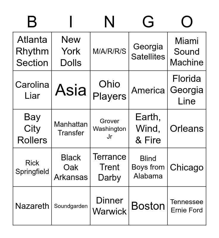 This bingo card has a free space and 59 words: Cypress Hill, Soundgarden, Dusty Springfield, Rick Springfield, Boston, Kansas, Asia, Europe, America, Cross Canadian Ragweed, Georgia Satellites, Alabama, Carolina Liar, Bastille, England Dan & John Ford Coley, Atlanta Rhythm Section, Tennessee Ernie Ford, Miami Sound Machine, Kentucky Headhunters, Ohio Players, Earth, Wind, & Fire, M/A/R/R/S, Nazareth, Chicago, Phoenix, Berlin, Trans Siberian Orchestra, Flo Rida, Florida Georgia Line, Confederate Railroad, India.Arie, Atlantic Starr, of Montreal, Timbuktu 3, New York Dolls, Little River Band, Oak Ridge Boys, Manhattan Transfer, L.A. Guns, Bay City Rollers, Brownsville Station, Black Oak Arkansas, Orleans, Portishead, Portugal, the Man, O-Town, Lakeside, David Essex, Terrance Trent Darby, Dinner Warwick, Julie London, Dinah Washington, Whitney Houston, John Denver, Beirut, Blind Boys from Alabama, Alabama Shakes, Buffalo Springfield and Grant Lee Buffalo.