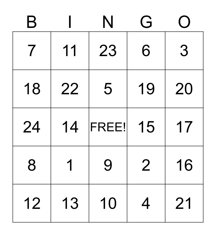 This bingo card has a free space and 24 words: 1, 13, 5, 12, 3, 7, 18, 11, 15, 9, 19, 24, 2, 16, 22, 4, 17, 23, 20, 14, 21, 8, 6 and 10.