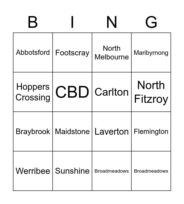 This bingo card has 17 words: Broadmeadows, Werribee, North Melbourne, Abbotsford, Maidstone, Maribyrnong, Flemington, Carlton, North Fitzroy, CBD, Sunshine, Laverton, Hoppers Crossing, Footscray, Braybrook, Glenroy and Broadmeadows.