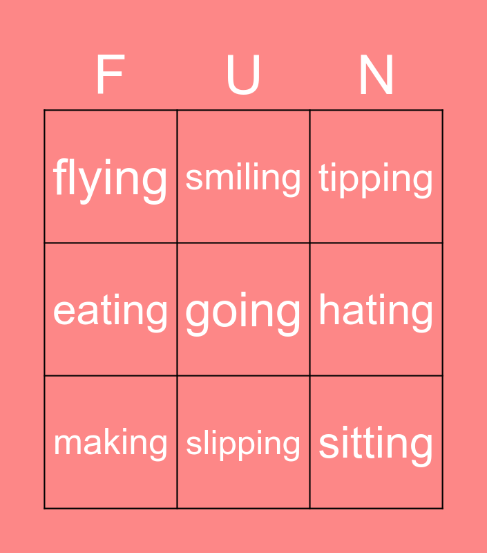 This bingo card has a free space and 8 words: eating, smiling, hating, making, tipping, flying, slipping and sitting.