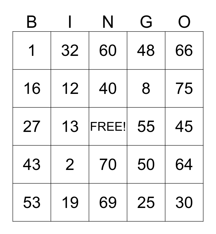 This bingo card has a free space and 24 words: 2, 19, 40, 53, 66, 1, 16, 32, 55, 70, 8, 27, 50, 64, 12, 25, 45, 60, 75, 13, 30, 43, 48 and 69.