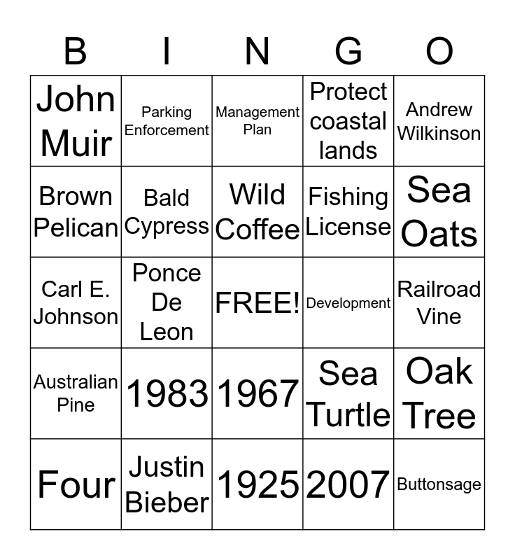 This bingo card has a free space and 24 words: 1983, Justin Bieber, Wild Coffee, Four, Andrew Wilkinson, John Muir, Brown Pelican, Parking Enforcement, Development, 1967, Fishing License, Carl E. Johnson, Sea Turtle, Oak Tree, Bald Cypress, 2007, Railroad Vine, Management Plan, Sea Oats, Ponce De Leon, Buttonsage, Australian Pine, Protect coastal lands and 1925.