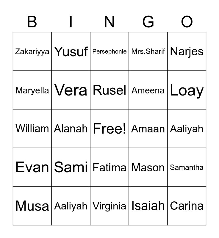 This bingo card has a free space and 24 words: Sami, Aaliyah, Rusel, Musa, Narjes, Zakariyya, Maryella, Yusuf, Amaan, Fatima, Ameena, William, Mason, Samantha, Vera, Isaiah, Aaliyah, Persephonie, Loay, Alanah, Carina, Evan, Mrs.Sharif and Virginia.