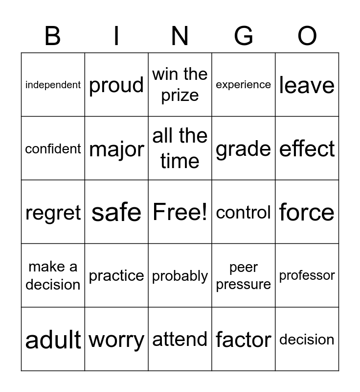 This bingo card has a free space and 24 words: practice, worry, all the time, adult, leave, independent, confident, proud, control, probably, grade, regret, peer pressure, professor, major, factor, force, win the prize, effect, safe, decision, make a decision, experience and attend.