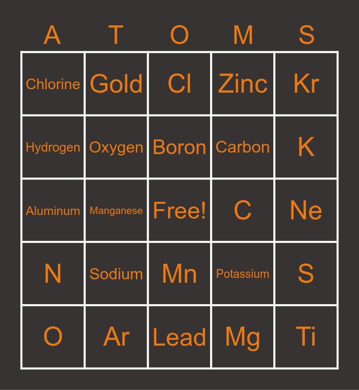 This bingo card has a free space and 70 words: neon, Ne, Argon, Flourine, Ar, Krypton, Zinc, Zn, Kr, Sulfur, S, Xenon, Chlorine, Cl, Xe, Manganese, Mn, Carbon, Nitrogen, N, C, Potassium, K, Cobalt, Helium, He, Co, Magnesium, Mg, Phosphorus, Gold, Au, P, Silver, Ag, Iodine, Copper, Cu, I, Hydrogen, H, Sodium, Ti, Na, Titanium, Oxygen, O, Mecury, Iron, Fe, Silicon, Platinum, Pt, Si, Lead, Pb, Boron, Beryllium, Be, B, Aluminum, Al, Nickel, Chromium, Cr, Ni, Lithium, Ca, Li and Calcium.