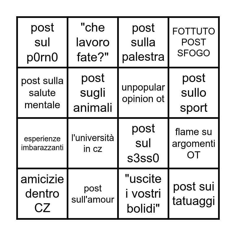 This bingo card has 16 words: post sull'amour, flame su argomenti OT, post sulla palestra, post sul p0rn0, esperienze imbarazzanti, "che lavoro fate?", post sul s3ss0, "uscite i vostri bolidi", post sulla salute mentale, post sugli animali, amicizie dentro CZ, FOTTUTO POST SFOGO, l'università in cz, post sullo sport, unpopular opinion ot and post sui tatuaggi.