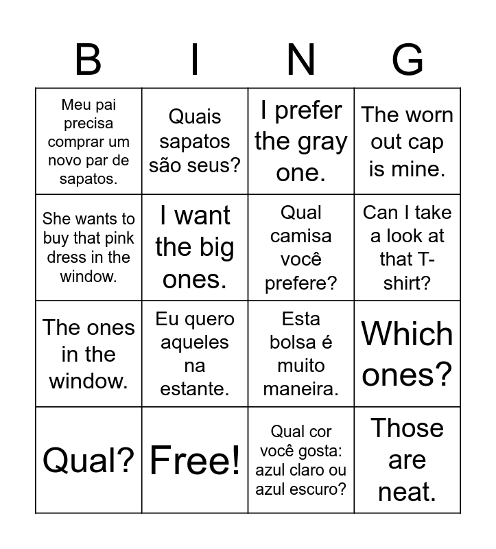 This bingo card has 24 words: Quais são suas cores favoritas?, I prefer the dark blue one., Can I take a look at that T-shirt?, Onde está meu boné preto e branco?, She wants to buy that pink dress in the window., Meu pai precisa comprar um novo par de sapatos., I want the big ones., Quais sapatos são seus?, Free!, Which cell phone is Sarah’s?, The ones in the window., Esta bolsa é muito maneira., I want to see that cell phone., My favorite colors are blue, white and red., Qual camisa você prefere?, Quais chaves são dele?, Qual cor você gosta: azul claro ou azul escuro?, I prefer the gray one., Eu quero aqueles na estante., Which ones?, Qual?, Those are neat., The worn out cap is mine. and Which calculator is ours?.
