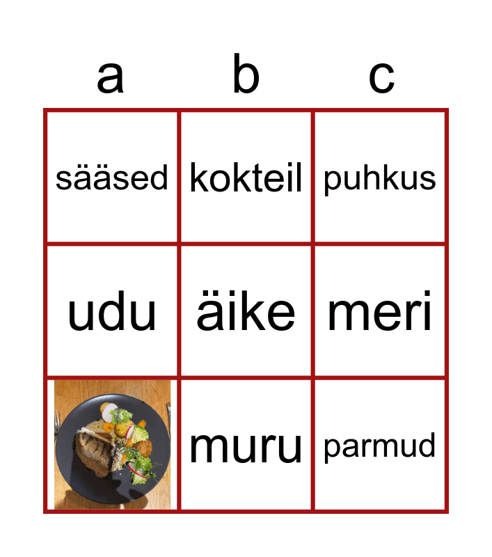 This bingo card has 1 images, a free space and 7 words: meri, puhkus, kokteil, sääsed, parmud, udu and muru.