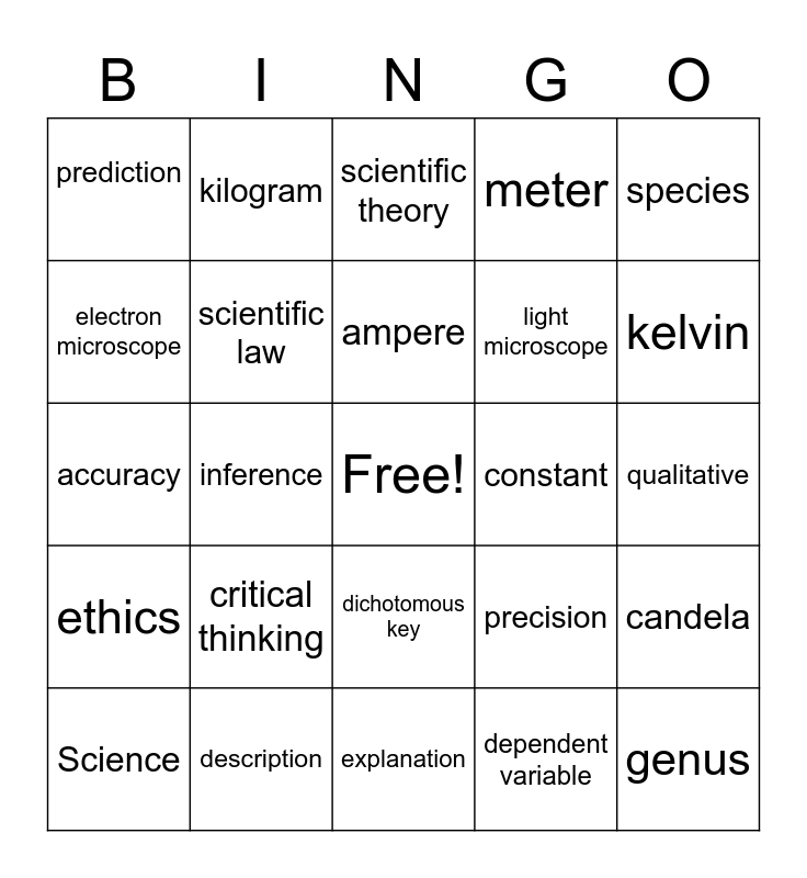 This bingo card has a free space and 29 words: Science, Observation, inference, hypothesis, prediction, scientific theory, scientific law, critical thinking, constant, description, qualitative, genus, explanation, dependent variable, kelvin, quantitative, dichotomous key, ethics, species, accuracy, precision, cladogram, light microscope, electron microscope, meter, kilogram, candela, ampere and binomial nomenclature.