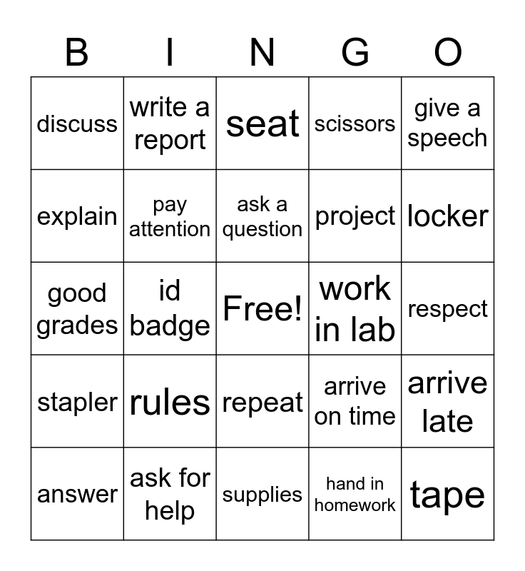 This bingo card has a free space and 24 words: rules, ask for help, ask a question, answer, give a speech, discuss, explain, write a report, work in lab, repeat, project, good grades, arrive on time, arrive late, pay attention, hand in homework, respect, seat, locker, id badge, tape, stapler, scissors and supplies.