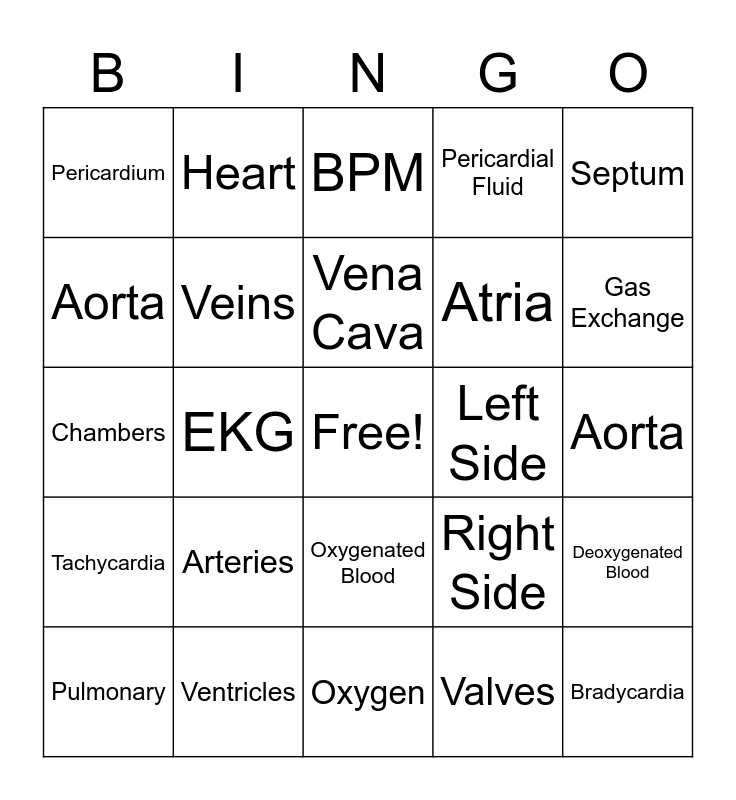 This bingo card has a free space and 24 words: Arteries, Ventricles, Vena Cava, Pulmonary, Septum, Pericardium, Aorta, Heart, Left Side, Oxygenated Blood, Atria, Chambers, Right Side, Deoxygenated Blood, Veins, Valves, Aorta, BPM, Gas Exchange, EKG, Bradycardia, Tachycardia, Pericardial Fluid and Oxygen.