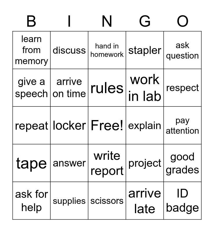 This bingo card has a free space and 24 words: answer, supplies, rules, ask for help, ask question, learn from memory, give a speech, discuss, explain, write report, work in lab, repeat, project, good grades, arrive on time, arrive late, pay attention, hand in homework, respect, locker, ID badge, tape, stapler and scissors.