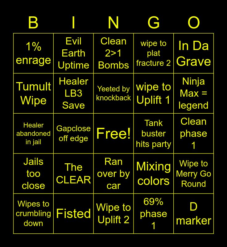 This bingo card has a free space and 24 words: The CLEAR, Fisted, Yeeted by knockback, Wipes to crumbling down, In Da Grave, 1% enrage, Tumult Wipe, Evil Earth Uptime, Tank buster hits party, Ran over by car, wipe to Uplift 1, Healer abandoned in jail, Mixing colors, Wipe to Merry Go Round, Healer LB3 Save, 69% phase 1, Clean phase 1, Clean 2>1 Bombs, Ninja Max = legend, Gapclose off edge, D marker, Jails too close, wipe to plat fracture 2 and Wipe to Uplift 2.