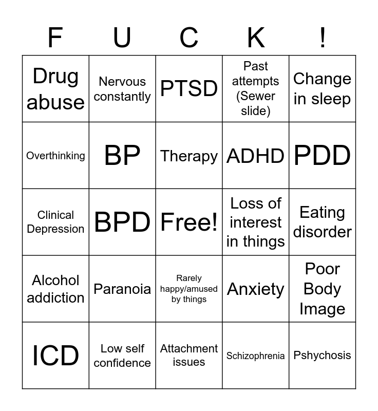 This bingo card has a free space and 24 words: Paranoia, Low self confidence, Therapy, ICD, Change in sleep, Drug abuse, Overthinking, Nervous constantly, Loss of interest in things, Rarely happy/amused by things, ADHD, Clinical Depression, Anxiety, Poor Body Image, BP, Schizophrenia, Eating disorder, PTSD, PDD, BPD, Pshychosis, Alcohol addiction, Past attempts (Sewer slide) and Attachment issues.