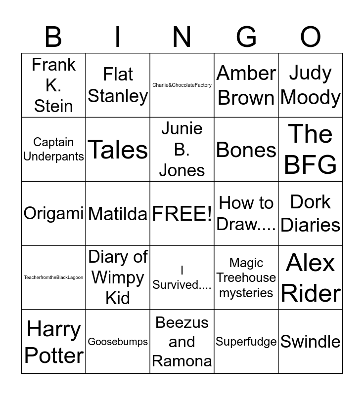 This bingo card has a free space and 24 words: Diary of Wimpy Kid, Goosebumps, Junie B. Jones, Harry Potter, Judy Moody, Frank K. Stein, Captain Underpants, Flat Stanley, How to Draw...., I Survived...., Bones, Origami, Magic Treehouse mysteries, Alex Rider, Tales, Superfudge, Dork Diaries, Charlie&ChocolateFactory, The BFG, Matilda, Swindle, TeacherfromtheBlackLagoon, Amber Brown and Beezus and Ramona.