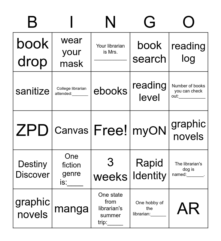 This bingo card has a free space and 24 words: One fiction genre is:____, manga, ebooks, graphic novels, reading log, book drop, sanitize, wear your mask, myON, 3 weeks, reading level, ZPD, Rapid Identity, The librarian's dog is named:_______., College librarian attended:_______, One hobby of the librarian:______, graphic novels, Your librarian is Mrs. ____________, Number of books you can check out:___________, Canvas, AR, Destiny Discover, book search and One state from librarian's summer trip:_____.