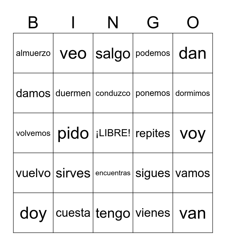 This bingo card has a free space and 29 words: doy, quiero, pido, puedo, almuerzo, salgo, duermen, sirves, repites, cuesta, voy, van, tengo, vienes, dormimos, sigo, encuentras, vuelvo, dan, volvemos, sigues, pongo, ponemos, damos, podemos, veo, vamos, conduzco and das.