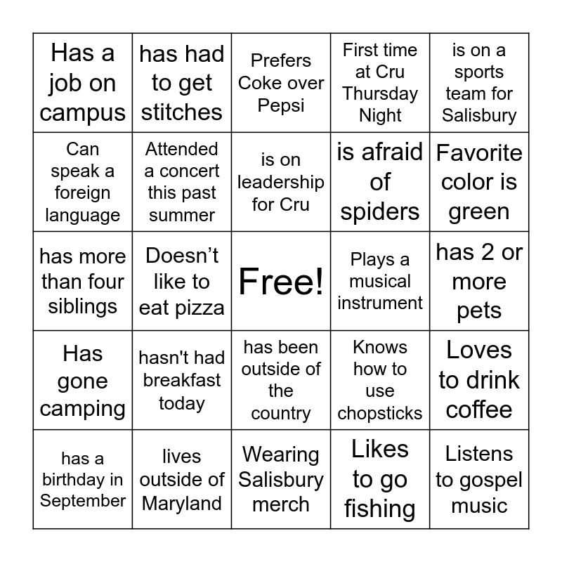 This bingo card has a free space and 24 words: hasn't had breakfast today, lives outside of Maryland, is on leadership for Cru, has a birthday in September, is on a sports team for Salisbury, Has a job on campus, Can speak a foreign language, has had to get stitches, Plays a musical instrument, has been outside of the country, is afraid of spiders, has more than four siblings, Knows how to use chopsticks, Loves to drink coffee, Attended a concert this past summer, Likes to go fishing, has 2 or more pets, Prefers Coke over Pepsi, Favorite color is green, Doesn’t like to eat pizza, Listens to gospel music, Has gone camping, First time at Cru Thursday Night and Wearing Salisbury merch.