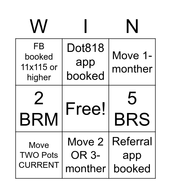 This bingo card has a free space and 8 words: 5 BRS, Move 1-monther, Dot818 app booked, Move TWO Pots CURRENT, FB booked 11x115 or higher, Referral app booked, 2 BRM and Move 2 OR 3-monther.