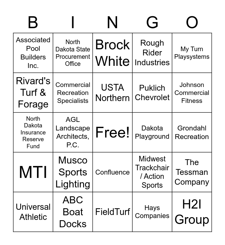 This bingo card has a free space and 30 words: ABC Boat Docks, Agassiz Seed & Supply, AGL Landscape Architects, P.C., Apex Engineering Group, Associated Pool Builders Inc., Brock White, Commercial Recreation Specialists, Confluence, Dakota Playground, FieldTurf, Grondahl Recreation, H2I Group, Hays Companies, Houston Engineering, Inc., Johnson Commercial Fitness, KLJ Engineering LLC, Midwest Trackchair / Action Sports, MTI, Musco Sports Lighting, My Turn Playsystems, North Dakota Insurance Reserve Fund, North Dakota Safety Council, North Dakota State Procurement Office, Puklich Chevrolet, Rivard's Turf & Forage, Rough Rider Industries, The Tessman Company, Universal Athletic, USTA Northern and WSB.
