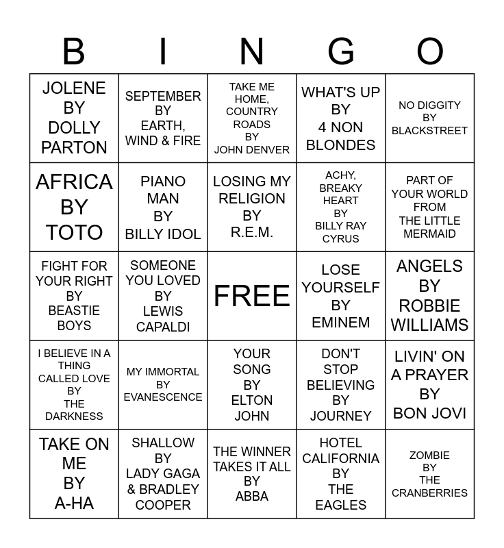 This bingo card has a free space and 30 words: SHALLOW BY LADY GAGA & BRADLEY COOPER, BOHEMIAN RHAPSODY BY QUEEN, SOMEONE YOU LOVED BY LEWIS CAPALDI, WONDERWALL BY OASIS, JOLENE BY DOLLY PARTON, TAKE ME HOME, COUNTRY ROADS BY JOHN DENVER, PIANO MAN BY BILLY IDOL, YOUR SONG BY ELTON JOHN, LOSE YOURSELF BY EMINEM, THE WINNER TAKES IT ALL BY ABBA, ANGELS BY ROBBIE WILLIAMS, ZOMBIE BY THE CRANBERRIES, HOTEL CALIFORNIA BY THE EAGLES, DANCING QUEEN BY ABBA, PART OF YOUR WORLD FROM THE LITTLE MERMAID, TOTAL ECLIPSE OF THE HEART BY BONNIE TYLER, DON'T STOP BELIEVING BY JOURNEY, I BELIEVE IN A THING CALLED LOVE BY THE DARKNESS, MY IMMORTAL BY EVANESCENCE, NO DIGGITY BY BLACKSTREET, FIGHT FOR YOUR RIGHT BY BEASTIE BOYS, BORN TO RUN BY BRUCE SPRINGSTEEN`, SEPTEMBER BY EARTH, WIND & FIRE, ACHY, BREAKY HEART BY BILLY RAY CYRUS, AFRICA BY TOTO, WHAT'S UP BY 4 NON BLONDES, LIVIN' ON A PRAYER BY BON JOVI, TAKE ON ME BY A-HA, LOSING MY RELIGION BY R.E.M. and UPTOWN GIRL BY BILLY JOEL.