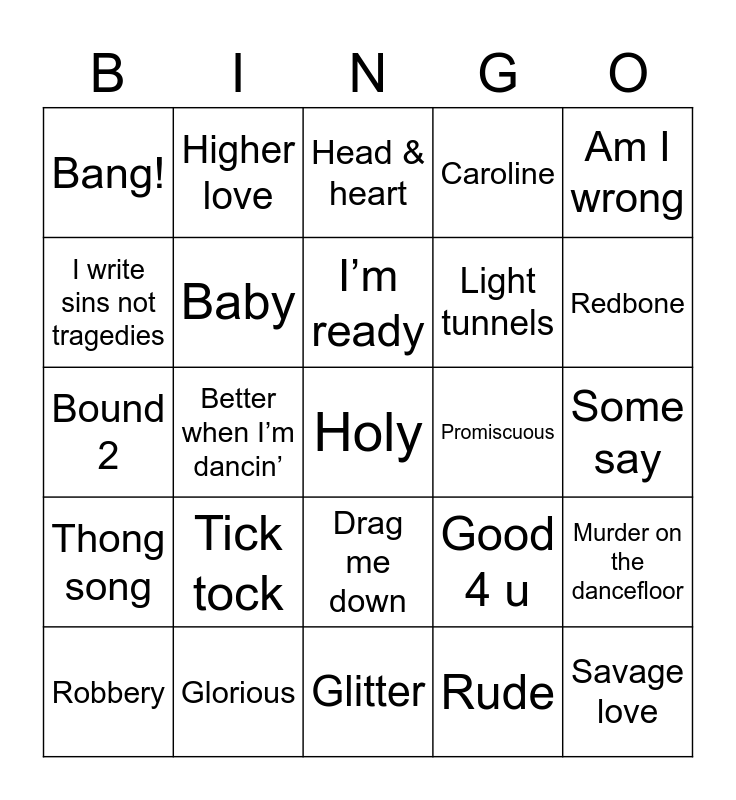 This bingo card has 36 words: Free!, Lose Yourself, Get low, Baby, Good 4 u, Thong song, I’m ready, Never seen the rain, Am I wrong, Exit sign, Better when I’m dancin’, Caroline, Bring it all back, Promiscuous, Redbone, Bang!, Savage love, Tick tock, Holy, Head & heart, Some say, Murder on the dancefloor, Glorious, Robbery, Glitter, Higher love, Bound 2, Choir, Light tunnels, I write sins not tragedies, Naïve, Teenage dirtbag, Rude, Drag me down, 1955 and Thrift shop.