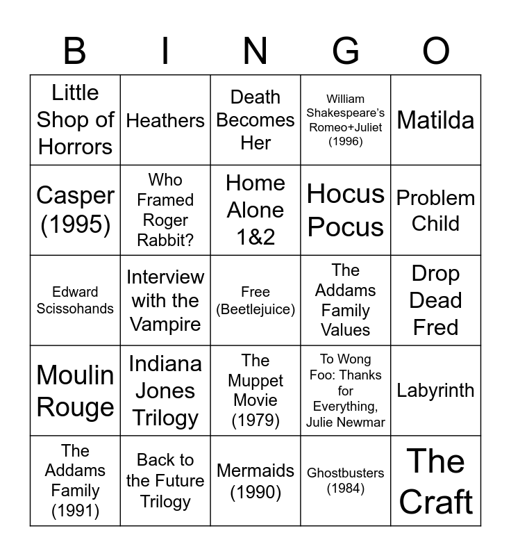 This bingo card has a free space and 24 words: Indiana Jones Trilogy, Back to the Future Trilogy, Home Alone 1&2, The Addams Family (1991), Matilda, Little Shop of Horrors, Casper (1995), Heathers, The Addams Family Values, The Muppet Movie (1979), Hocus Pocus, Edward Scissohands, To Wong Foo: Thanks for Everything, Julie Newmar, Labyrinth, Who Framed Roger Rabbit?, Ghostbusters (1984), Drop Dead Fred, Death Becomes Her, Problem Child, Interview with the Vampire, The Craft, Moulin Rouge, William Shakespeare’s Romeo+Juliet (1996) and Mermaids (1990).