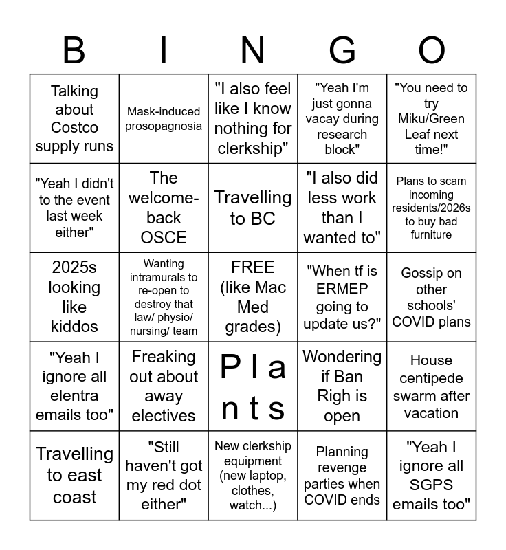 This bingo card has a free space and 24 words: Freaking out about away electives, "Still haven't got my red dot either", Travelling to BC, Travelling to east coast, "You need to try Miku/Green Leaf next time!", Talking about Costco supply runs, "Yeah I didn't to the event last week either", Mask-induced prosopagnosia, "When tf is ERMEP going to update us?", P l a n t s, "I also did less work than I wanted to", 2025s looking like kiddos, Wondering if Ban Righ is open, House centipede swarm after vacation, The welcome-back OSCE, Planning revenge parties when COVID ends, Gossip on other schools' COVID plans, "I also feel like I know nothing for clerkship", Plans to scam incoming residents/2026s to buy bad furniture, Wanting intramurals to re-open to destroy that law/ physio/ nursing/ team, "Yeah I ignore all SGPS emails too", "Yeah I ignore all elentra emails too", "Yeah I'm just gonna vacay during research block" and New clerkship equipment (new laptop, clothes, watch...).