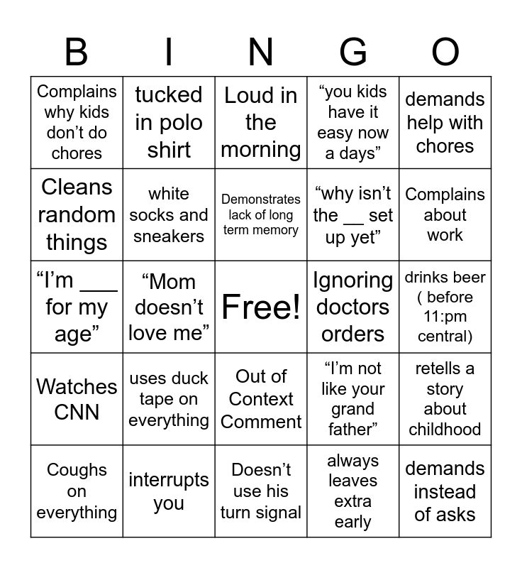 This bingo card has a free space and 91 words: Story time: Repeats any Story told already, Demonstrates Lack of Short term Memory, Out of Context Comment, Falls Asleep anywhere but his own bed, Show-and-tell: picture of random junk, drinks beer at family event, Beard Comment, Follows you to your car when you are trying to leave, “never ending remodel”, Unprompted House repair, Smokes weed any time of day, Leaves and forgets phone at home, Changes TV channel and leaves room, drinks beer ( before 11:pm central), Agrees with someone else’s objectively outrageous comment, Demonstrates lack of long term memory, Unprompted Vehicle repair, Monochromatic outfit, Is that racist? (probably), Talks about food he can’t/won’t eat, Doesn’t know how to interact with dogs (animals?), “Bums”, Doesn’t use his turn signal, Over sharing unimportant info, “I’m ___ for my age”, interrupts you, “I’m not pushing”, Criticizes a stranger, “Well, I don’t know what you guys want, Gives unwanted advise, Awaits to be served hand and foot, retells a story about childhood, Asks someone to do chore, Watches CNN, Complains why kids don’t do chores, “you kids have it easy now a days”, Loud in the morning, Complains about trump, “Mom doesn’t love me”, Complains about work, Coughs on everything, Cleans random things, Loud sneezing, Loud Nose Blowing, Clears throat, “I’m not like your grand father”, Slams toilet seat, slams doors, Neighborhood watch, Drives one handed, acts like he’s in American idol, “why isn’t the __ set up yet”, “is anyone ready to eat yet?’, Complains about siblings, Drinks diet soda, “elbow grease”, Ignoring doctors orders, “illegal to turn on interior car light”, Has thick wallet, Grunts when sitting, Thinks he can out smart gps, back seat driver, Thinks it’s okay to eat expired food (regardless of type), rubs/pats belly after meal, backs into every parking spot, “you can do mine next”, Puts a condiment on everything, always leaves extra early, “don’t tell your mom”, “I’m just resting my eyes”, uses duck tape on everything, demands instead of asks, complains about kids on devices, “what do I like from ___ (this place)”, tucked in polo shirt, white socks and sneakers, complains about weather, interrupts conversation he wasn’t a part of, Is anxious dad, walks like a zombie, complains about back/knee pain, demands help with chores, says something sexist, doesn’t get out of chair to greet, does something weird/ socially unacceptable, Says you like things that you don’t, Learned Helplessness, Doesn’t know how to send emails, talks loudly over voice or video chat, doesn’t read manuals and Pisses loudly.