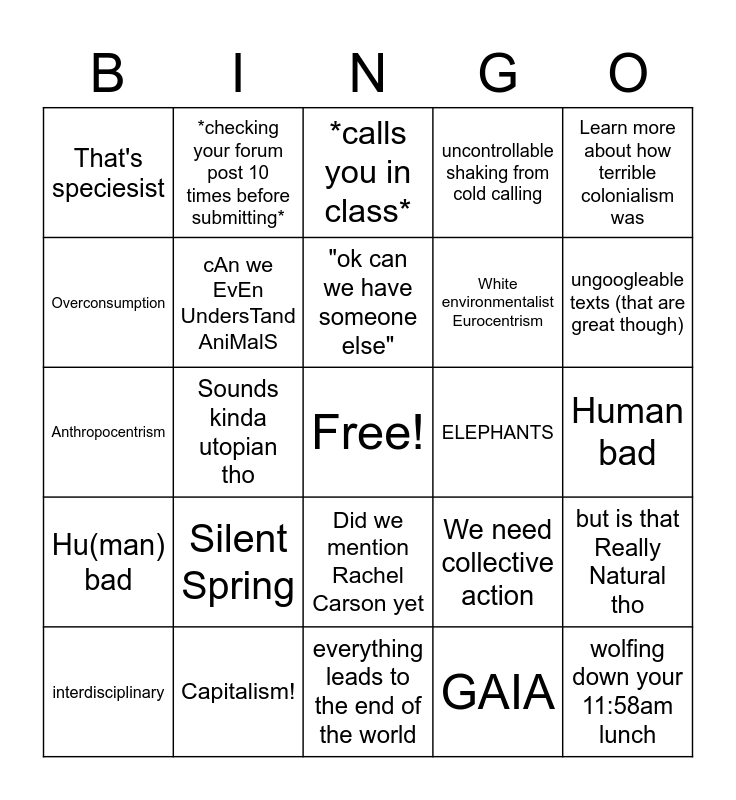 This bingo card has a free space and 24 words: Silent Spring, Capitalism!, "ok can we have someone else", interdisciplinary, Learn more about how terrible colonialism was, That's speciesist, Overconsumption, *checking your forum post 10 times before submitting*, ELEPHANTS, Did we mention Rachel Carson yet, White environmentalist Eurocentrism, Anthropocentrism, We need collective action, but is that Really Natural tho, cAn we EvEn UndersTand AniMalS, GAIA, Human bad, *calls you in class*, ungoogleable texts (that are great though), Sounds kinda utopian tho, wolfing down your 11:58am lunch, Hu(man) bad, uncontrollable shaking from cold calling and everything leads to the end of the world.