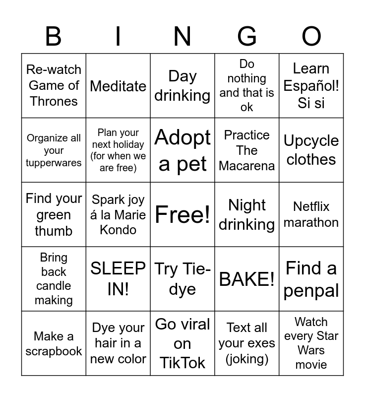 This bingo card has a free space and 49 words: Complete a puzzle, Start a journal, Dust off the trombone, Text all your exes (joking), Netflix marathon, Download Candy Crush, Meditate, Treat your skin, Practice The Macarena, Learn how to Floss, Organize all your tupperwares, Spark joy á la Marie Kondo, BAKE!, Watch every Star Wars movie, KNIT!, Take a bubble bath with a glass of wine, Day drinking, Night drinking, Perfect grandma's bolognese recipe, Re-watch Game of Thrones, Dye your hair in a new color, Go viral on TikTok, Do nothing and that is ok, Learn Español! Si si, Study the art of beatboxing, SLEEP IN!, Adopt a pet, Master watercolours, Find a penpal, Bring back candle making, Picnic in the livingroom, Try Tie-dye, Celebrate Christmas (why not?), Play nail salon, Make a scrapbook, Do string art, Make sock puppets, Play Jackbox, Upcycle clothes, Have a go at Macrame, Play ping pong, Treat yourself to Champagne, Indulge in virtual karaoke, Organize an At-home Scavenger hunt, Find your green thumb, Plan your next holiday (for when we are free), Whip up a workout routine, Dress up your pet and SMILE MORE!.