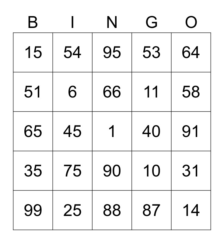 This bingo card has a free space and 24 words: 75, 25, 66, 99, 64, 15, 51, 54, 40, 90, 11, 65, 10, 31, 6, 87, 91, 95, 58, 45, 14, 35, 53 and 88.