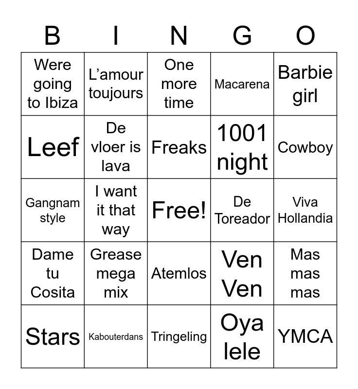 This bingo card has a free space and 51 words: Follow the leader, YMCA, Ik voel me zo verdomd alleen, Tringeling, Grease mega mix, Springen nondeju, L’amour toujours, Links rechts, Leef, Dans met tante Rita, De vloer is lava, Macarena, Mas mas mas, Ven Ven, Rainbow in the sky, Tsunami, Freaks, De Toreador, Have you ever been mellow, Barbie girl, I want it that way, Oya lele, Were going to Ibiza, 1001 night, Mamma Mia, Hardcore feelings, Cowboy, Don’t Stop me now, Stars, One more time, Waterloo, I will always love you, What makes you beautiful, Que si Que no, Girl just wanna have fun, Kabouterdans, Children of the night, Arcade, Feest waarvan ik morgen niks meer weet, Atje voor de sfeer, Viva Hollandia, Dame tu Cosita, Huts, The lion sleeps tonight, Wannabe, Despacito, Gangnam style, Laat het los, Het kuikentje piep, Atemlos and Captain Jack.